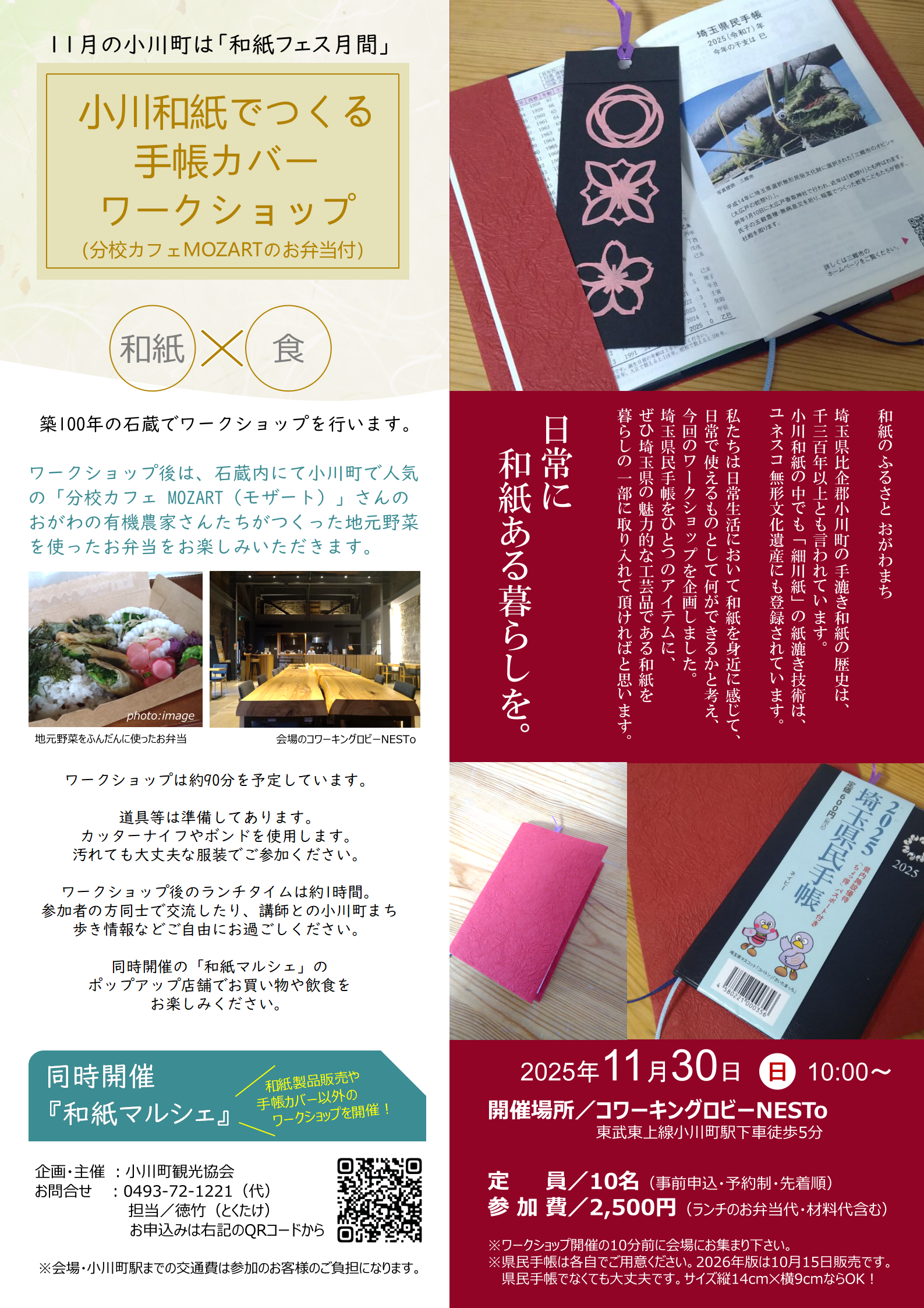 2025年11月30日(日)、小川町観光協会では、小川和紙を使った「小川和紙でつくる手帳カバーワークショップ」を実施いたします。