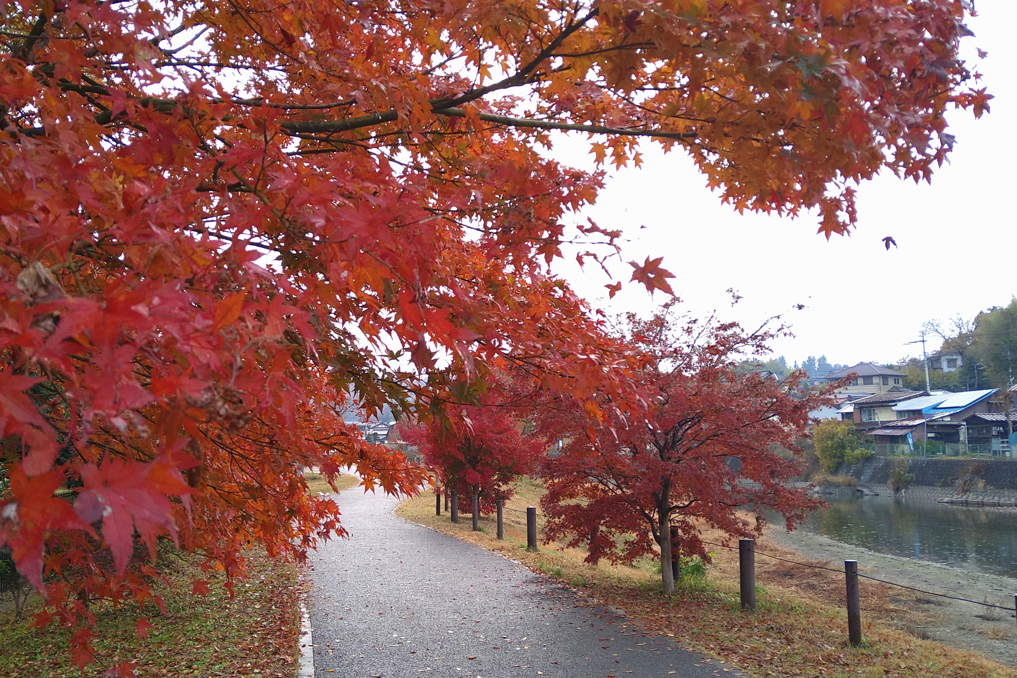 栃本親水公園のモミジがだいぶ色付いて見頃を迎えています。