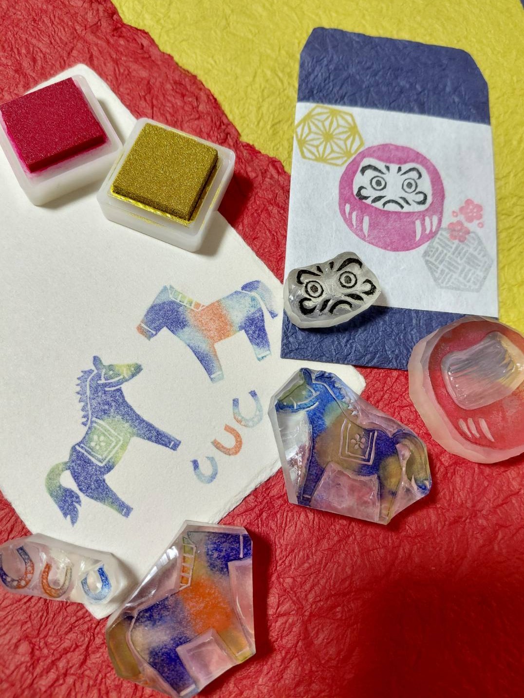 ハガキやポチ袋に消しゴムはんこを押して、オリジナルのデコレーションハガキ&ポチ袋をつくりましょう。