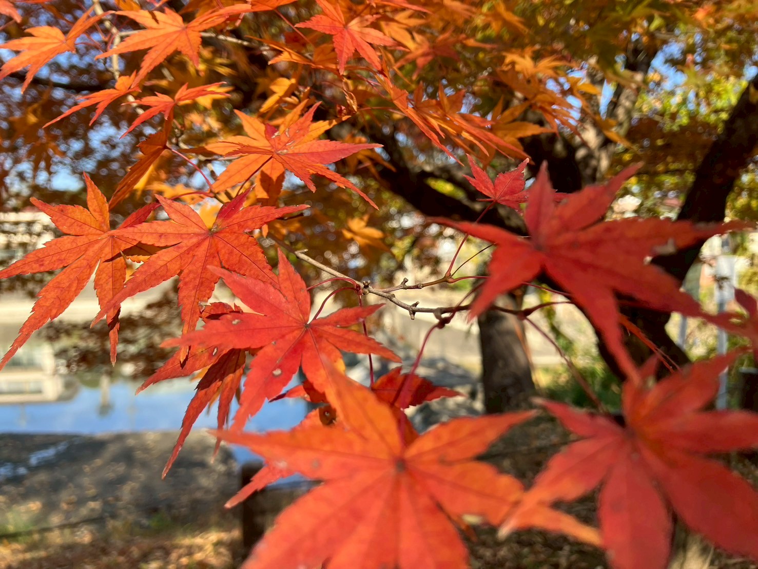 栃本親水公園のモミジ。少しずつ散り始めています。