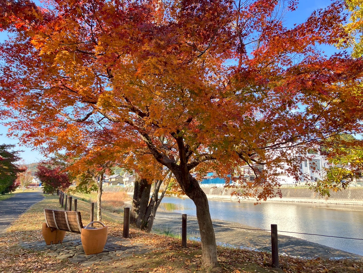 栃本親水公園のモミジがだいぶ色付いて見頃を迎えています。