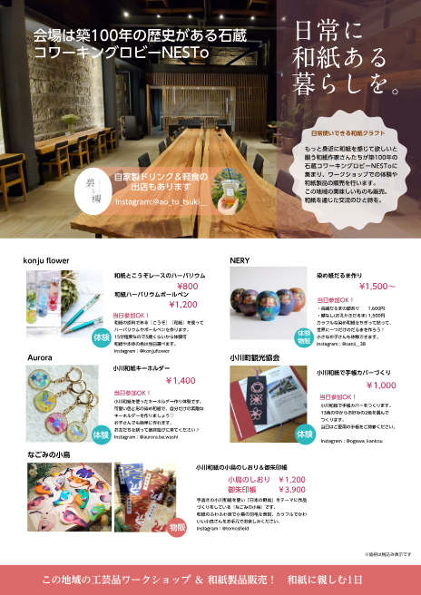和紙好きの作家たちが築100年の石蔵 コワーキングロビーに集まり、ワークショップを通じて和紙の魅力に触れ作家さんたちとの交流を図ります。