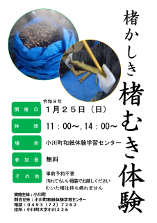楮かしき(この地方では「かずかしき」といいます)とは、和紙のふるさと小川町で昔から行われていた和紙づくりの最初の作業。みんなで楮の木から和紙に使う皮を蒸かして剥ぐ作業のことです。小川町の冬の風物詩になっています。この時期にしか体験できないものです。
